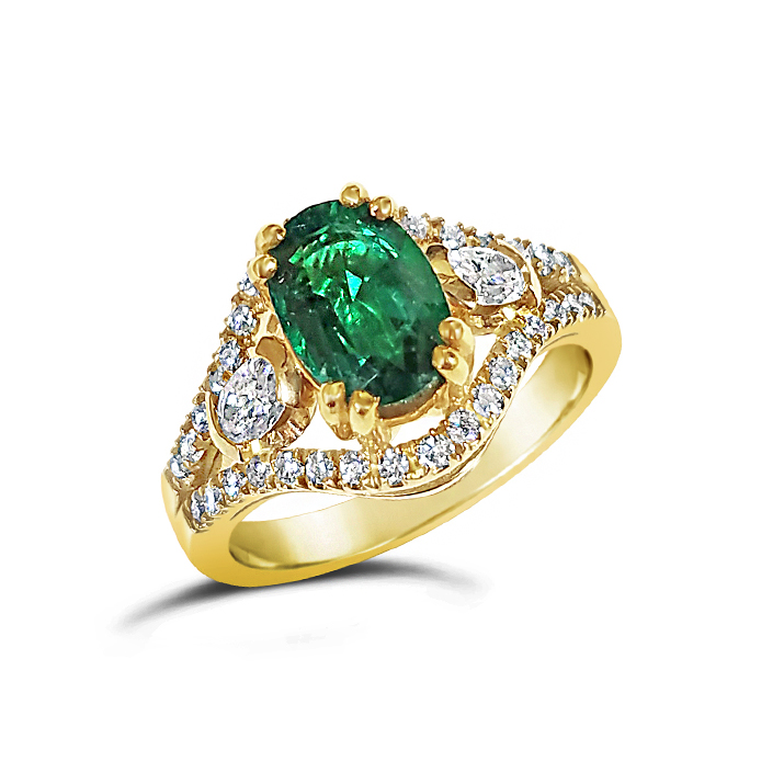 This design features an oval cut emerald that weighs 1.55 carat. The side diamonds have a total weight of .63 carats.