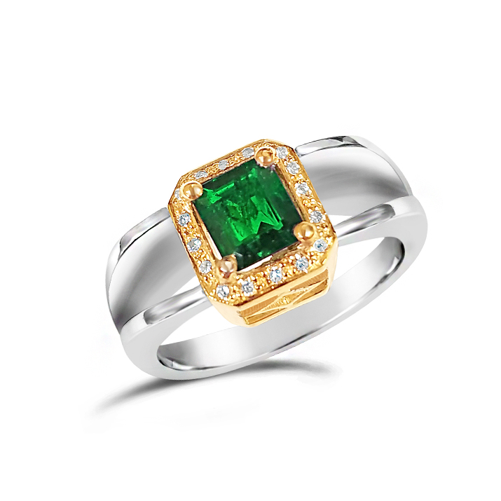 This design features a square cut emerald that weighs .37 carat. The side diamonds have a total weight of .10 carats.
