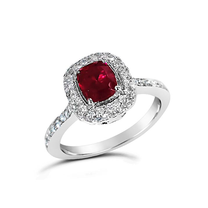This design features a cushion cut ruby that weighs .81 carat. The side diamonds have a total weight of .40 carats.