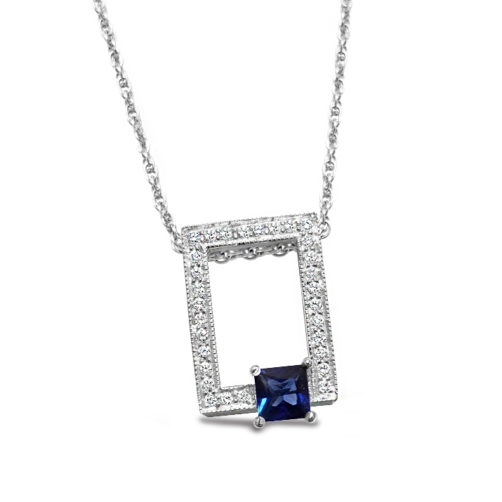 This design features a square cut sapphire that weighs .59 carat. The side diamonds have a total weight of .25 carats. Chain not included.