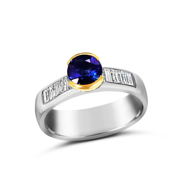 This contemporary design features a round sapphire that weighs .94 carat. The baguette cut diamonds have a total weight of .46 carats.
